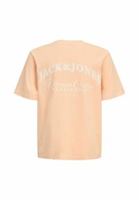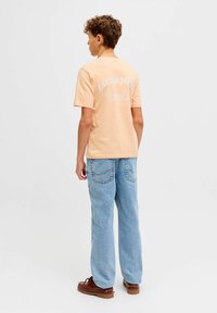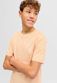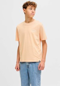 Adolescent garçon debout, faisant face à l'avant, portant un t-shirt pêche, un jean bleu clair et des chaussures marron à lacets sur un fond uni.