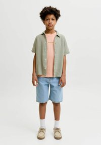 Garçon debout, portant une chemise verte claire à boutons par-dessus un t-shirt rose, un short en jean, des chaussettes blanches et des chaussures beiges, sur un fond blanc uni.