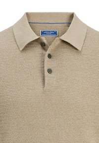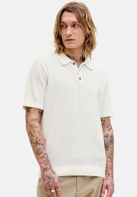 Homme tatoué portant un polo blanc à manches courtes, un pantalon beige et des chaussures en cuir marron, debout devant un fond uni.