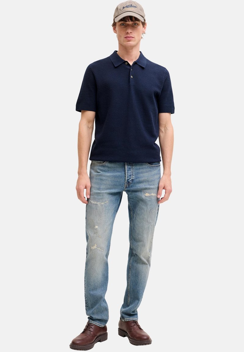 Jeune homme portant un polo bleu marine à manches courtes, un jean clair usé, des chaussures marron et une casquette beige, debout face à l'avant sur un fond blanc.