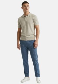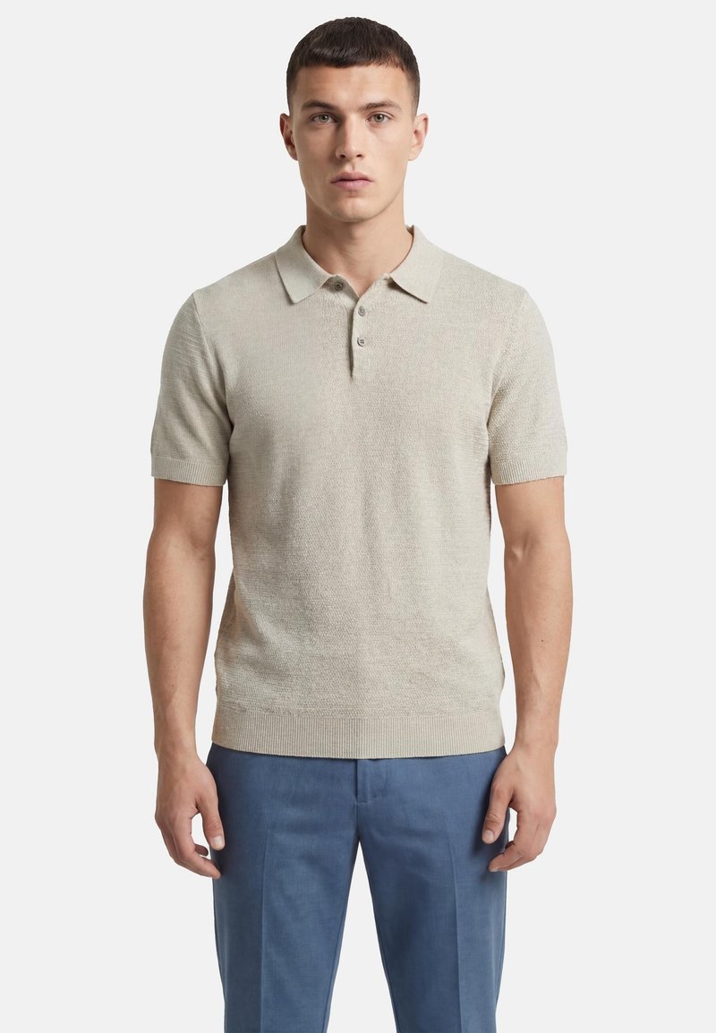 Jeune homme aux cheveux courts et foncés portant une chemise en maille beige à manches courtes avec col et un pantalon bleu, debout devant un fond blanc uni.