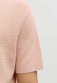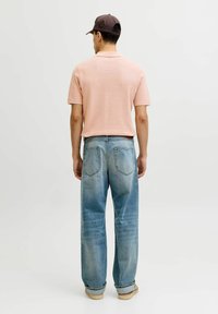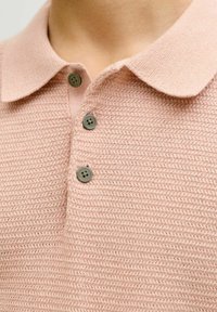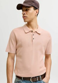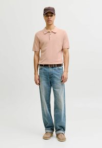 Jeune homme portant un polo manches courtes rose pâle, un jean bleu, une ceinture marron, une casquette marron foncé et des tatouages visibles sur les mains sur un fond clair.