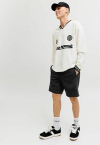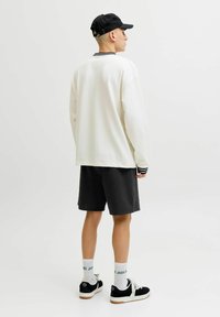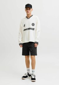 Personne portant un short noir jusqu'aux genoux, des chaussettes blanches montantes avec un texte vert, des baskets noir et blanc, et un haut blanc à manches longues avec des poignets rayés noirs.
