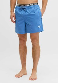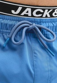 Homme portant un short de bain bleu mi-cuisse avec cordon de serrage, poches latérales et ceinture marquée Jack & Jones, debout pieds nus sur fond blanc.