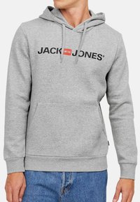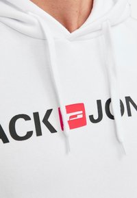 Homme portant un sweat à capuche blanc Jack & Jones, un jean bleu clair avec des patchs à l'avant et des baskets blanches, debout devant un fond uni.