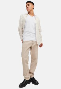 Jeune homme portant un t-shirt blanc à col en V, une chemise beige rayée déboutonnée, un pantalon beige et des chaussures noires, debout devant un fond blanc uni.