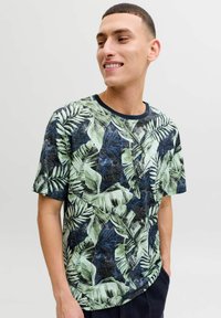 Jeune homme portant un T-shirt à manches courtes bleu marine avec des motifs de feuilles tropicales vertes et bleues, debout devant un fond clair uni.