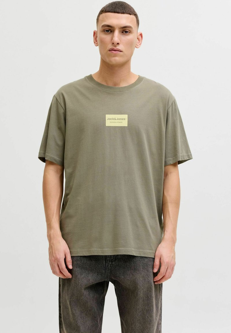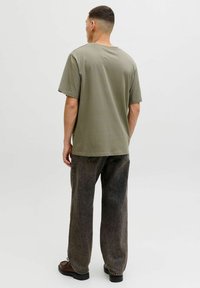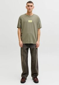 Jeune homme aux cheveux courts portant un t-shirt olive de Jack & Jones et un jean gris foncé, debout devant un fond clair uni.