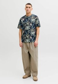 Jeune homme portant un t-shirt bleu marine à imprimé feuilles tropicales et un pantalon beige, debout devant un fond clair uni.