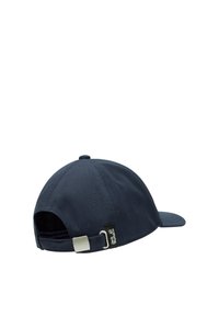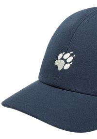 Casquette bleu marine avec une visière incurvée et un logo d'empreinte de patte sur le devant. Dispose d'une sangle réglable et d'un intérieur plissé pour le confort.
