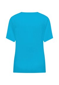 Gros plan sur une personne portant un t-shirt bleu vif Jack Wolfskin montrant le logo sur la poitrine ainsi qu'une partie du cou et de l'épaule.