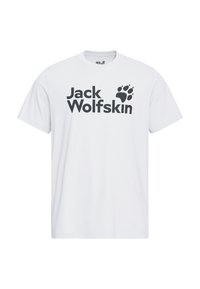 T-shirt blanc à manches courtes avec le logo "Jack Wolfskin" en lettres noires audacieuses et un motif d'empreinte de patte. Confectionné en tissu léger.