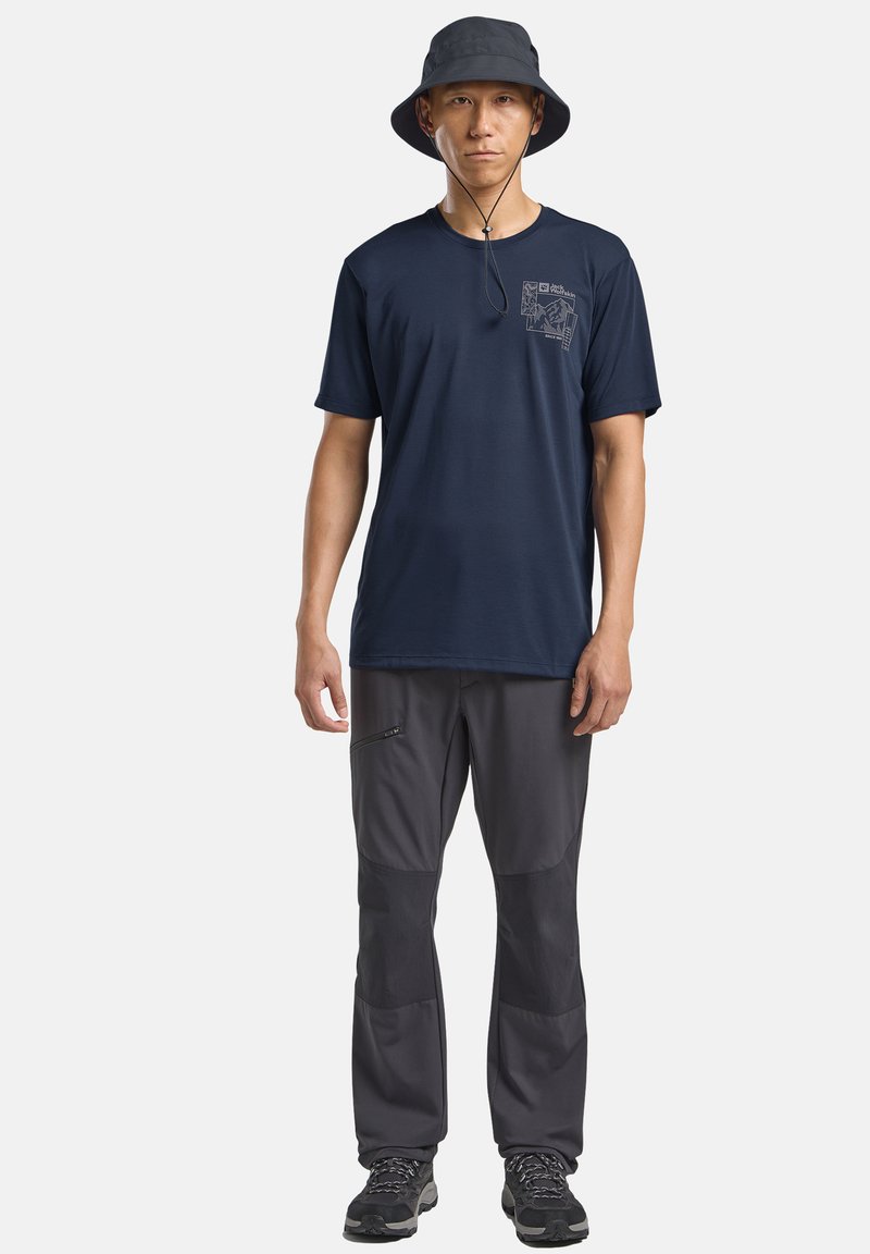 Homme debout portant un chapeau seau noir, un t-shirt bleu marine à manches courtes avec un motif graphique, un pantalon de randonnée gris foncé et des chaussures de randonnée noires.
