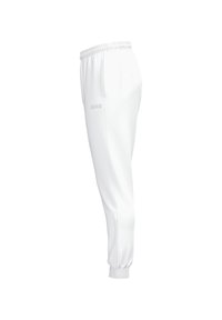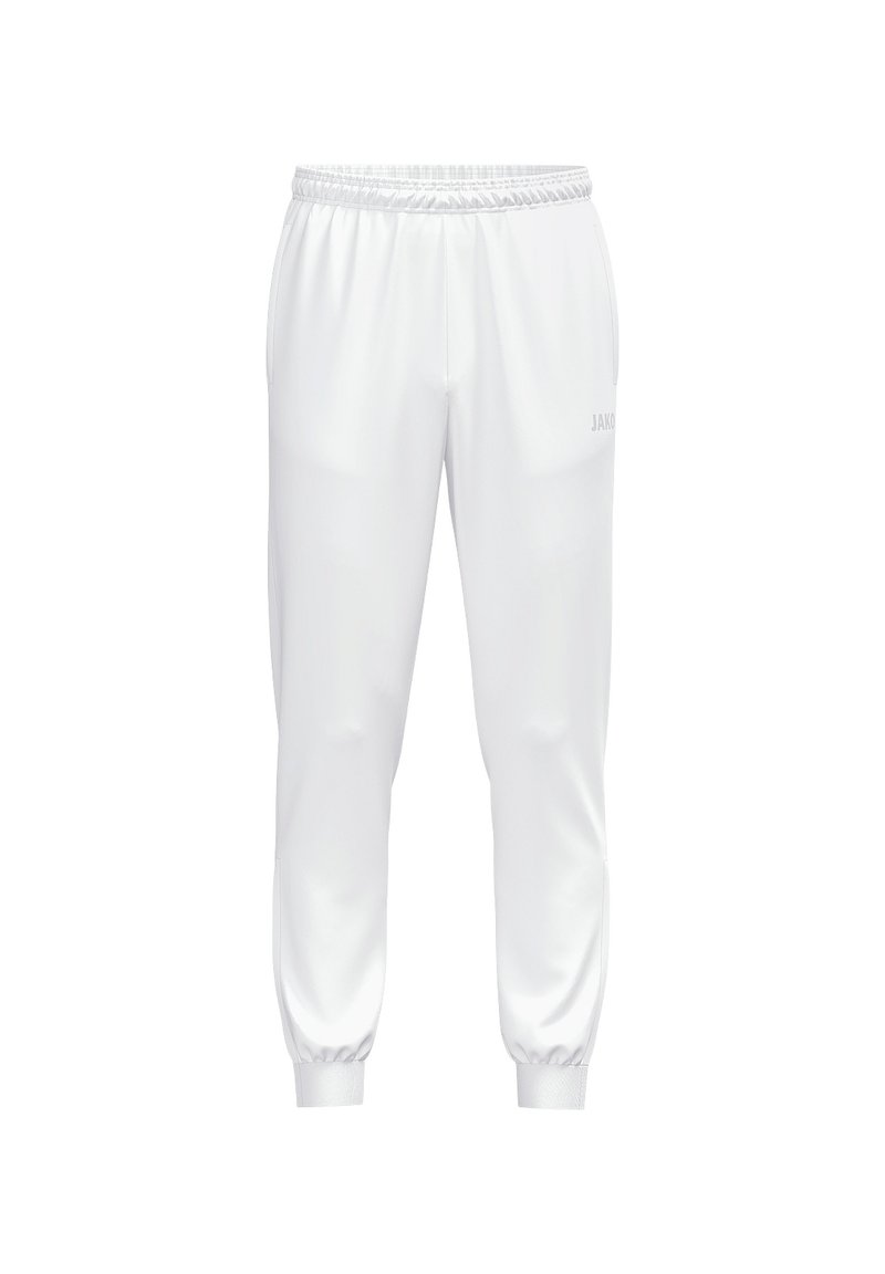 Pantalon de jogging athlétique blanc avec taille et poignets élastiques, doté de poches latérales et d'un logo JAKO discret sur la cuisse droite.