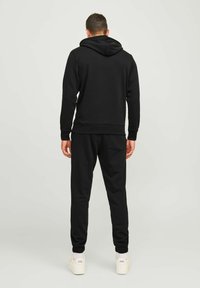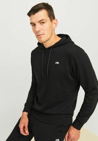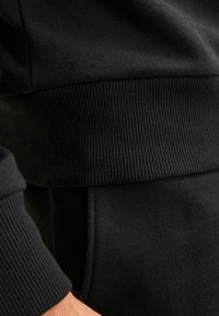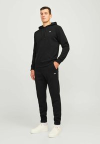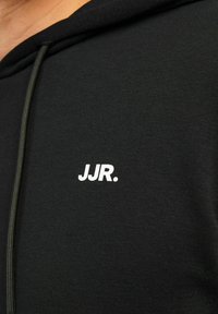 Homme portant un sweat à capuche noir et un pantalon de jogging assorti, tous deux avec un petit logo blanc "JJR.", debout avec une main dans la poche devant un fond uni.