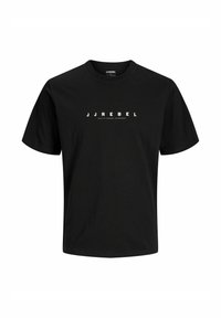 Jeune homme portant un t-shirt blanc avec le texte "JJREBEL" sur le devant et un jean bleu, debout devant un fond gris clair uni.