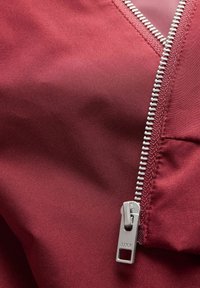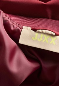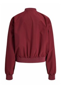 Veste bomber bordeaux avec fermeture éclair sur le devant, col et poignets côtelés, et poches latérales. Fabriquée en tissu lisse avec une coupe décontractée.