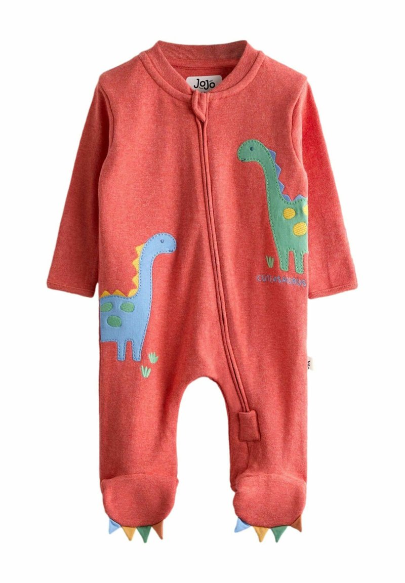 Body rouge en coton à manches longues, avec des appliqués de dinosaures bleus et verts, fermeture éclair et détails colorés imitant des écailles sur les pieds.