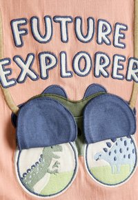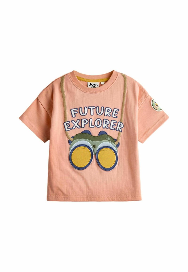 T-shirt pour enfant de couleur pêche avec des jumelles brodées et le texte "FUTURE EXPLORER" sur le devant, manches courtes et encolure ronde.