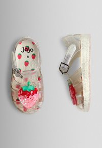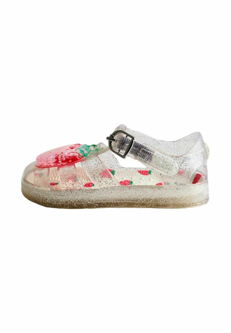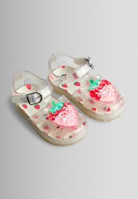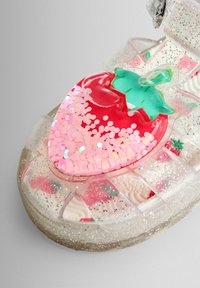 Sandale en gelée pour enfants transparente et scintillante avec décoration fraise et bride à boucle, vue de côté sur fond blanc.