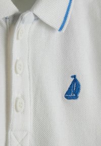 Polo pour tout-petit à manches courtes blanc avec col bordé de bleu, trois boutons, petit logo de voilier bleu sur la poitrine et étiquette noire sur la manche.