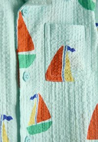 Chemise à manches courtes bleu clair pour tout-petit, avec col, poche poitrine, boutons et un motif de voilier coloré en orange, vert, jaune et bleu.
