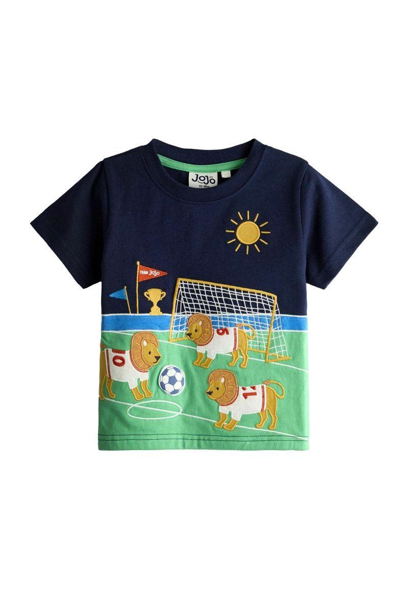 Chemise pour enfants bleu marine et verte avec des lions portant des maillots de football jouant avec un ballon sur un terrain, avec un but, un trophée, des drapeaux et le soleil.