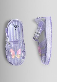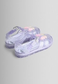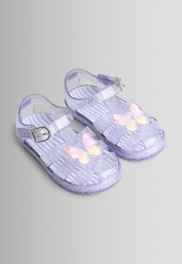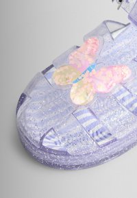 Sandale en plastique transparent violet pailleté avec une bride à boucle et une décoration papillon rose sur le dessus.