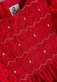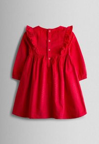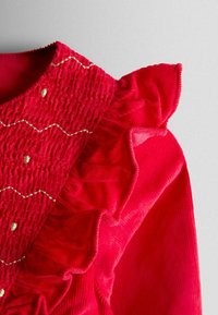 Robe rouge à manches longues en coton, présentant un col à volants et des détails froncés avec une broderie subtile. Jupe évasée.