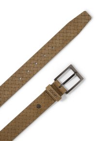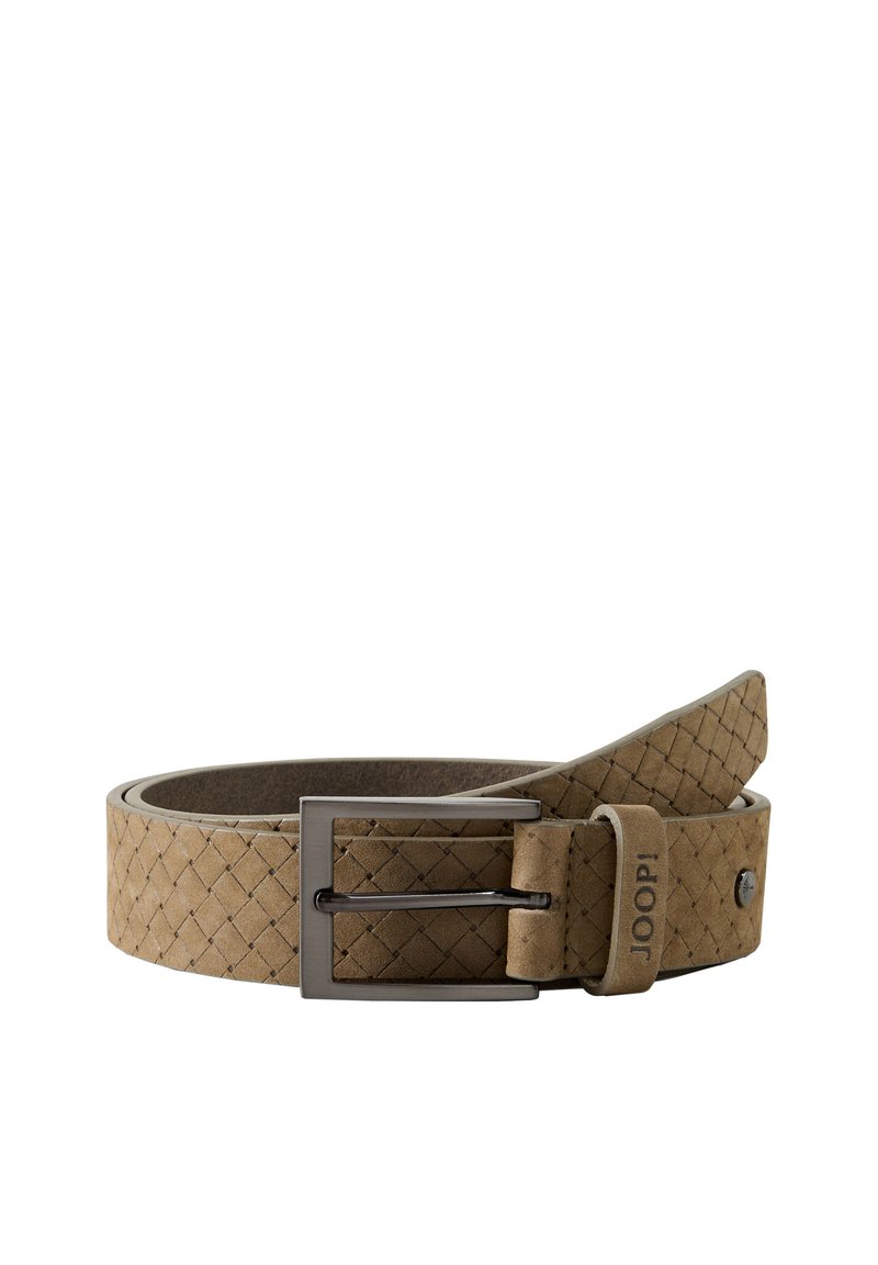 Ceinture en cuir tressé marron clair avec boucle rectangulaire en métal et « JOOP! » embossé sur la boucle en cuir.