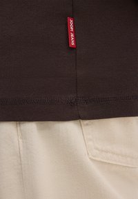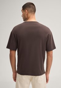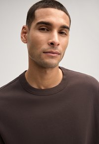 Homme debout de face, portant un t-shirt à manches courtes marron foncé uni et un pantalon beige clair, sur un fond neutre.