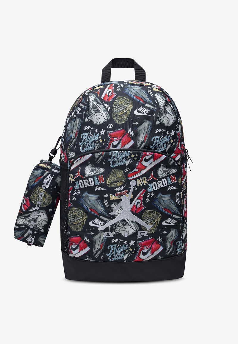 Sac à dos noir et pochette avec une chaussure Air Jordan colorée, un anneau de basketball et des motifs de texte "Flight Club", ainsi que le logo Jumpman sur la poche avant.