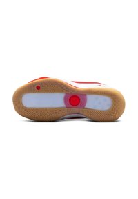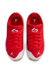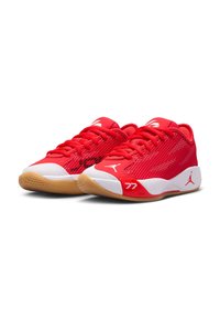 Baskets basses rouges et blanches de sport avec dessus en mesh, semelle en gomme et logo Jumpman sur le côté et la zone des orteils.