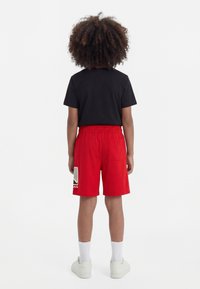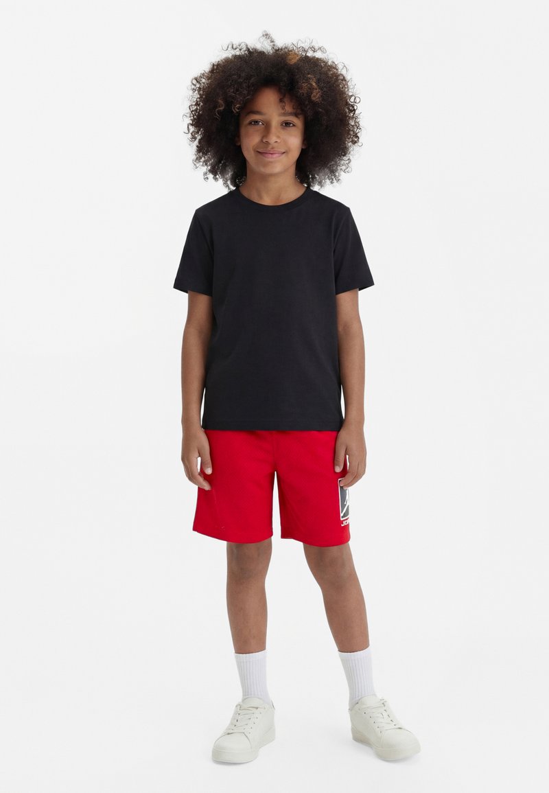 Un enfant se tient face à l'avant, portant un t-shirt noir, un short rouge avec un logo blanc, des chaussettes blanches et des baskets blanches sur fond blanc.