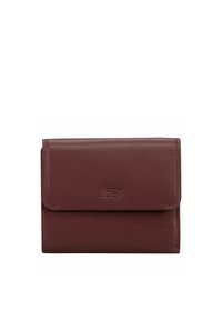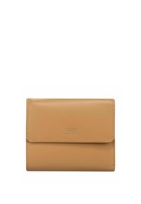 Portefeuille compact en cuir fauve avec fermeture à rabat et logo discrètement embossé sur le devant, présenté sur un fond blanc.