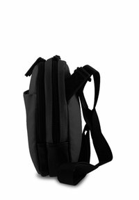 Sac à dos carré noir en tissu texturé ; il dispose d'une fermeture éclair sur le dessus et d'une poche avant. Le logo de la marque est embossé sur le devant.