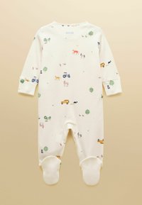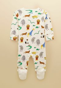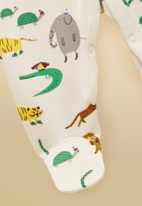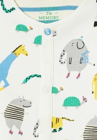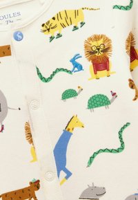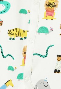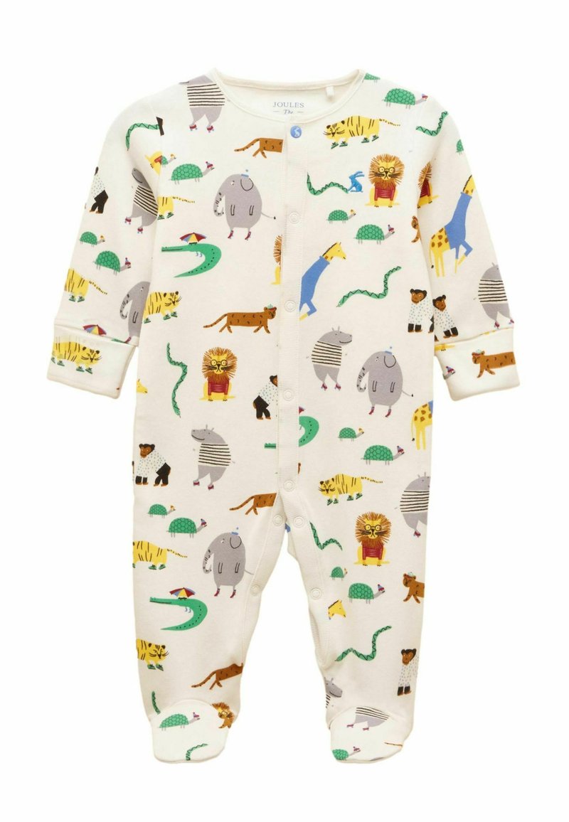 Body blanc pour bébé avec boutons-pression, présentant des animaux de dessin animé colorés, dont des lions, éléphants, girafes, tigres et serpents.