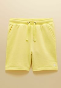 Deux paires de shorts en polaire avec cordons de serrage et poches latérales, l'une jaune et l'autre rose, présentées sur un fond blanc.