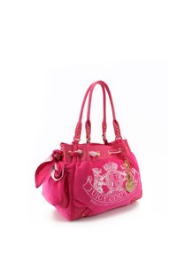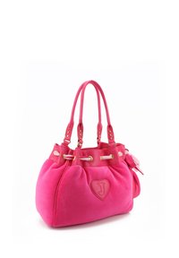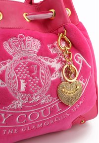 Femme portant un débardeur noir et un jean pattes d'éléphant, tenant un sac à main rose Juicy Couture et portant des sandales à plateforme argentées pailletées.
