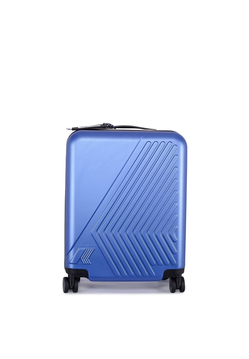 Valise rigide bleue avec des lignes embossées en diagonale et quatre roues pivotantes noires sur fond blanc.