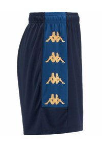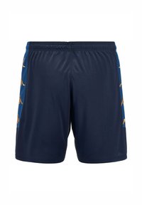 Shorts de sport bleu marine avec taille élastique et panneaux latéraux arborant des motifs répétitifs de logos jaunes assis.