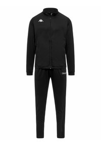 Survêtement noir Kappa avec veste zippée et pantalon assorti, avec logo blanc sur la poitrine de la veste et la cuisse du pantalon.