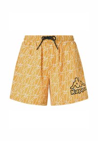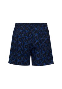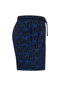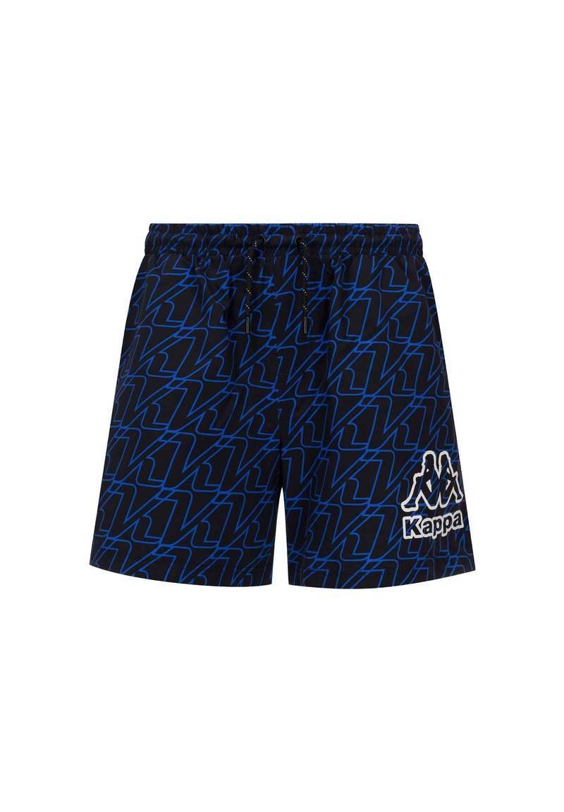 Shorts noirs avec un motif en zigzag bleu, taille élastique avec cordon, et logo Kappa en blanc sur le bas à gauche.