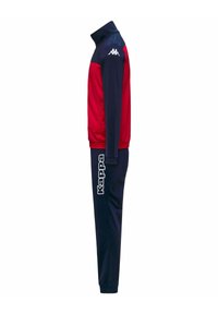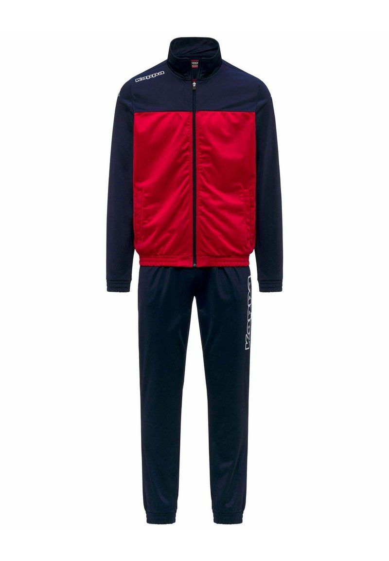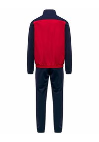 Veste de sport rouge et bleu marine zippée avec un pantalon de survêtement bleu marine assorti comportant un texte de logo blanc sur la jambe gauche.