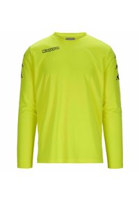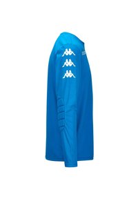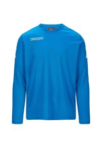 T-shirt de sport à manches longues bleu en tissu lisse ; arbore le logo Kappa en blanc sur la poitrine et les manches. Design léger et décontracté.