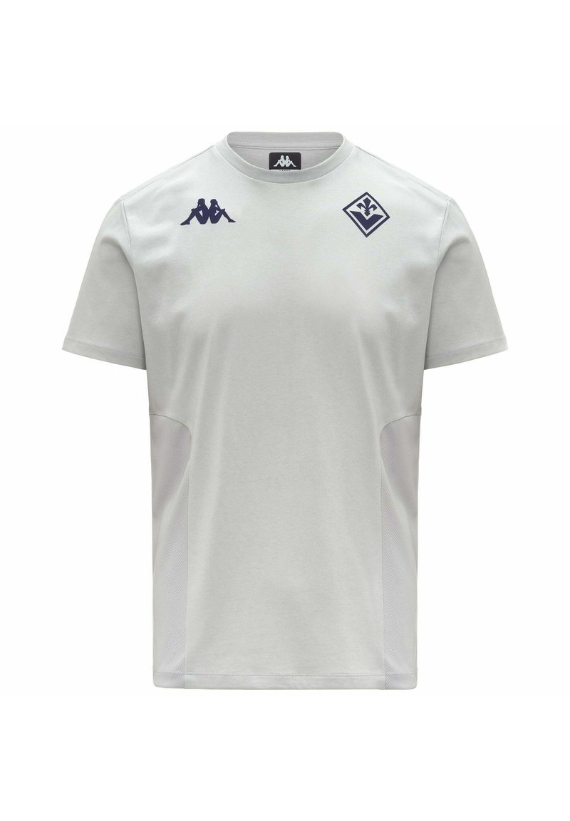 T-shirt de sport gris clair à manches courtes avec logo Kappa bleu foncé et emblème en forme de losange avec une fleur de lys sur la poitrine.