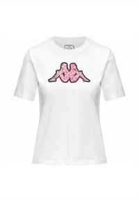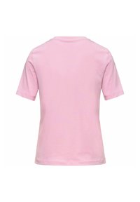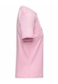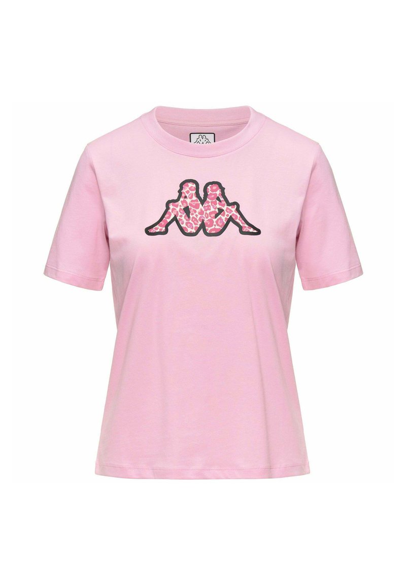 T-shirt rose clair à manches courtes avec un col rond, arborant un motif central représentant deux silhouettes assises avec un imprimé léopard rose.