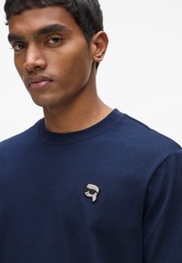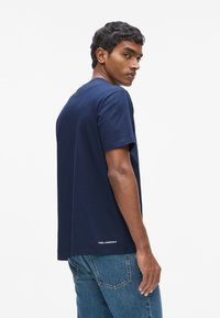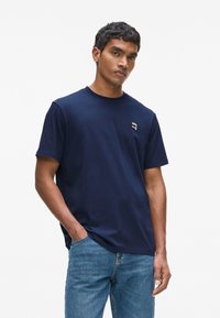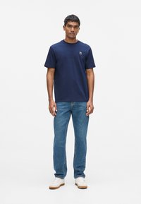 Homme portant un t-shirt bleu marine avec un petit logo sur la poitrine et un jean bleu, debout avec une main dans la poche contre un fond blanc.