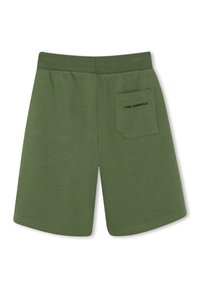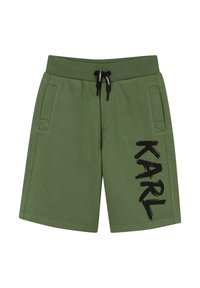 Shorts verts jusqu'au genou avec cordon de serrage noir et grand texte noir "KARL" imprimé verticalement sur la jambe droite. Deux poches latérales.