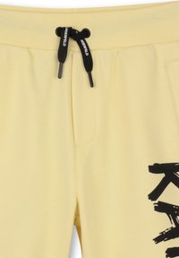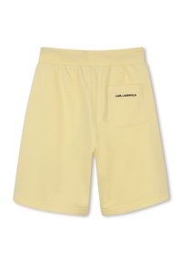 Shorts jaune clair avec cordon noir et grand texte noir "KARL" imprimé verticalement sur la jambe droite, avec poches latérales.
